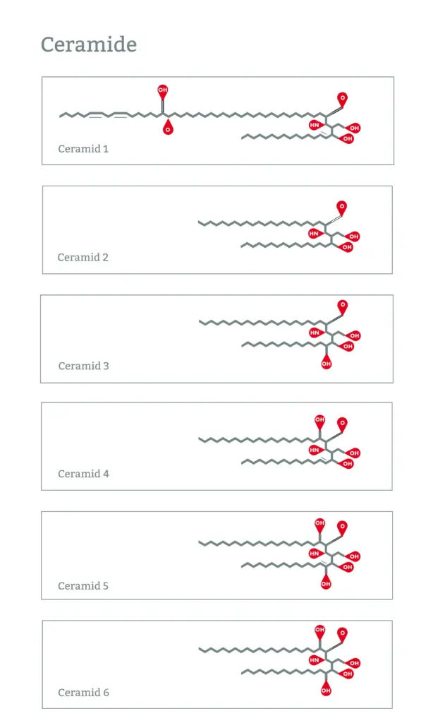 These different types perform slightly different tasks in the skin barrier. Ceramides 1, 2, 3, and 6-II are particularly important for the protective function and moisture retention.